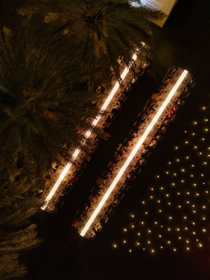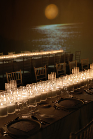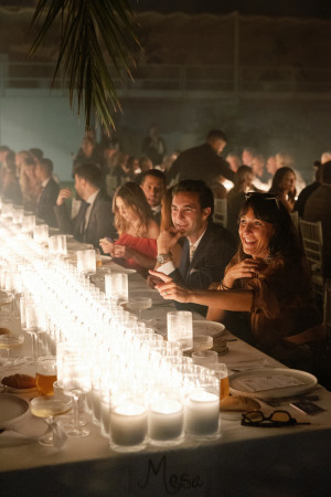 For the reception, two long, impeccably styled tables welcomed guests, glowing under the soft flicker of over 800 candles, creating an intimate yet elegant atmosphere. The dinner setting was further transformed by a breathtaking projection of the sea, illuminated by a moonlit glow-a seamless fusion of nature and refined event design. Every element was thoughtfully curated, resulting in a wedding that was not just an event, but an immersive, sophisticated experience.