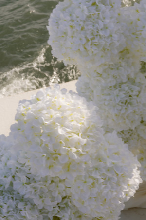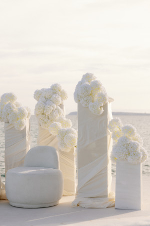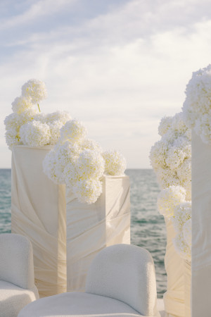 Set against the breathtaking backdrop of the Mediterranean Sea in Costa Blanca, this destination wedding was a masterpiece of elevated design and curated sophistication. The ceremony unfolded by the water’s edge, where draped columns surrounded the couple, their flowing fabric mimicking the shimmering effect of the ocean. A sea of white hydrangeas framed the vows, enhancing the scene’s minimal yet luxurious aesthetic.